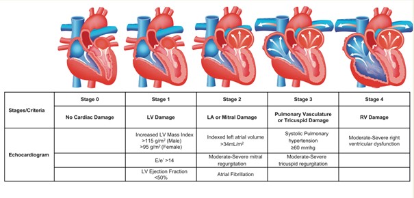 L’approche dite de « staging » permet une évaluation intégrée du remodelage morpho-fonctionnel des cavités cardiaques. Elle est particulièrement utile chez les patients âgés présentant des symptômes équivoques, lorsque l’épreuve d’effort n’est pas réalisable. Toutefois, cette approche repose sur des données observationnelles et le dommage cardiaque extra-valvulaire ne peut être systématiquement considéré comme imputable à la valvulopathie, justifiant la recherche systématique d’autres causes d’atteinte cardiaque.