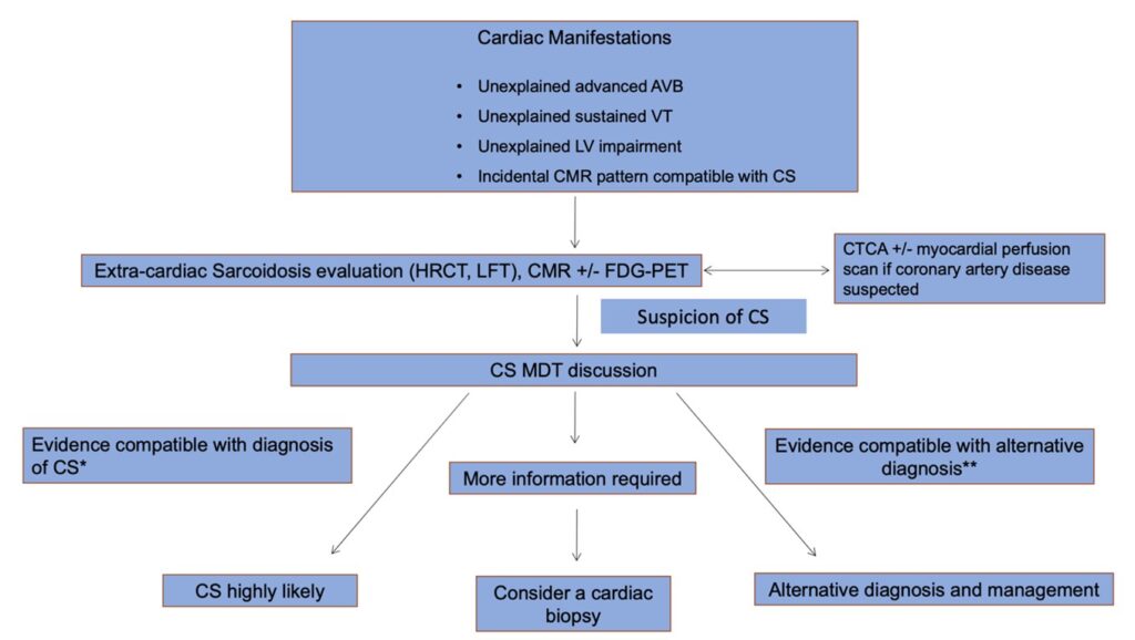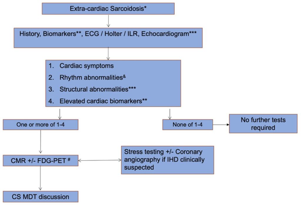 Chez les patients présentant des manifestations cardiaques sans cause évidente retrouvée (BAV de haut grade, tachycardie ventriculaire soutenue ou insuffisance cardiaque), une IRM cardiaque est recommandée afin d’exclure une sarcoïdose cardiaque, complétée par une TEP au ¹⁸F-FDG. La découverte fortuite à l’IRM cardiaque d’anomalies évocatrices de sarcoïdose justifie également une évaluation spécifique, incluant la recherche d’une atteinte extracardiaque. La probabilité diagnostique de sarcoïdose cardiaque est ensuite discutée en réunion pluridisciplinaire.