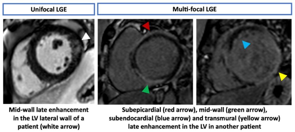 Le diagnostic repose principalement sur le rehaussement tardif, typiquement intramyocardique ou sous-épicardique, souvent irrégulier, nodulaire et multifocal, avec une prédilection pour les segments basaux de la paroi latérale ou du septum interventriculaire, bien que les présentations soient hétérogènes (Figure 3).