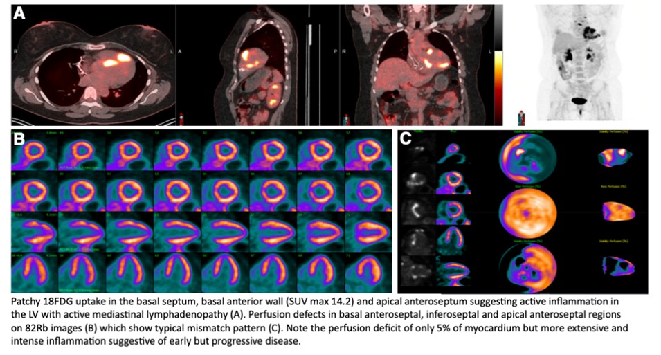 La TEP au ¹⁸F-FDG est recommandée dans le bilan diagnostique de la sarcoïdose cardiaque suspectée. Complémentaire de l’IRM, elle apporte des informations essentielles sur la localisation, l’activité, le stade et l’étendue de la maladie. Elle permet également d’identifier des atteintes extracardiaques accessibles à une biopsie et constitue un outil majeur pour l’évaluation de la réponse au traitement et la stratification du risque. La TEP-FDG doit également être réalisée lorsque l’IRM est contre-indiquée, non contributive ou normale malgré une forte suspicion clinique.