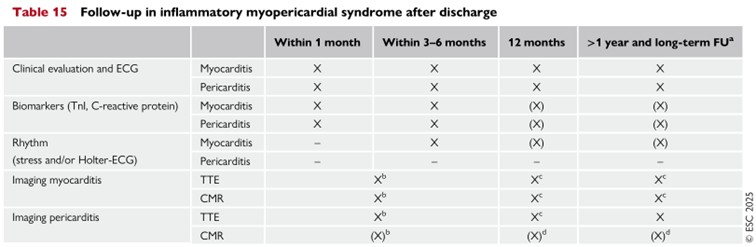 - Schulz-Menger J, Collini V, Gröschel J, et al; ESC Scientific Document Group. 2025 ESC Guidelines for the management of myocarditis and pericarditis. Eur Heart J. 2025;46:3952-4041.